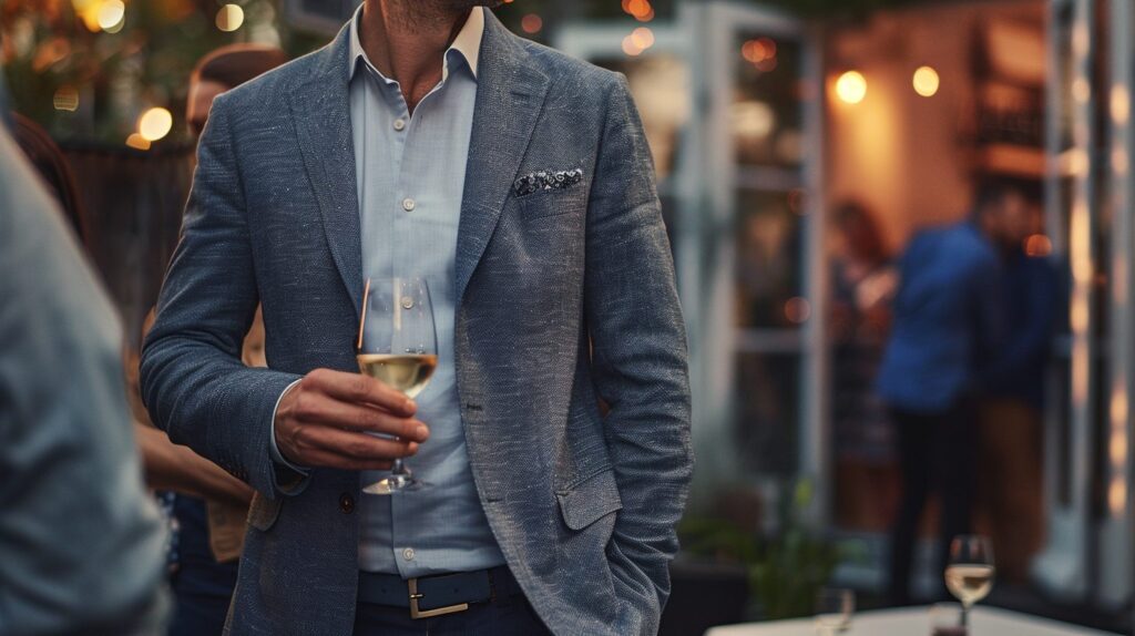 For dinners and galas, choose darker colors and subtle sheen fabrics, and add a sleek tie with polished black shoes. For outdoor or garden parties, opt for lighter shades and breathable fabrics like linen, paired with loafers or suede shoes. For business-related events, keep patterns minimal and stick to navy or gray with a conservative tie. The goal is to balance professionalism and personality with clean lines, confident colors, and a composed finish.
