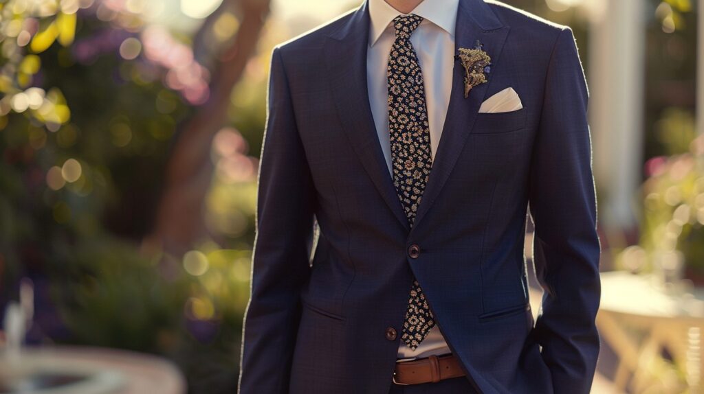 A navy suit paired with a white shirt, brown Oxford shoes, and a patterned tie with a white pocket square creates a classic and polished cocktail outfit.