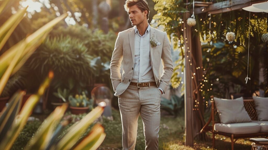 Light gray or beige linen suit, pale blue shirt, brown loafers, no tie for relaxed charm.