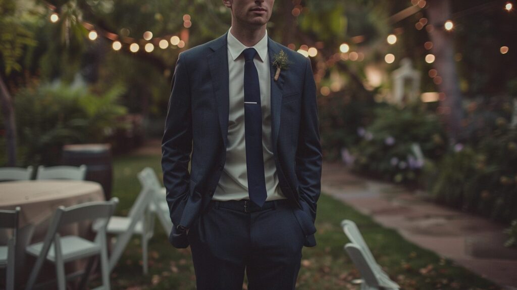 Charcoal or midnight blue suit, crisp white shirt, black dress shoes, silk tie in deep tone (burgundy, navy, or forest green). Match your formality to the setting—beach, garden, or ballroom—and consider the season before choosing fabrics and colors.